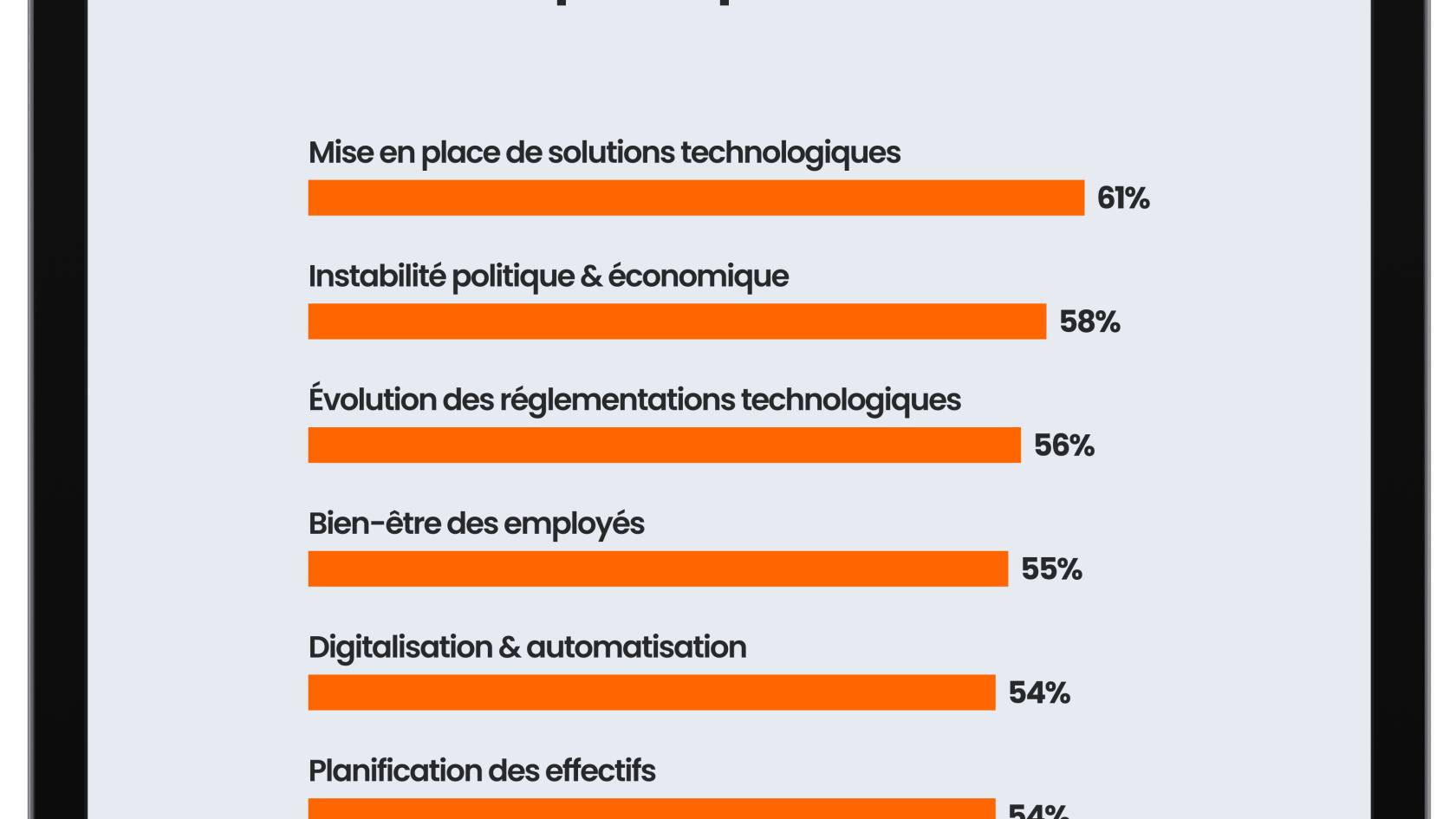 Les entreprises interrogées ont révélé qu'elles étaient confrontées en moyenne à sept défis critiques : la mise en œuvre de solutions technologiques (sélectionné par 61 % des sondés), l’instabilité politique et économique (pour 58 %), l’évolution de la réglementation qui encadre la technologie (pour 56 %), le bien-être des employés (pour 55 %), la digitalisation et l’automatisation (pour 54 %), les capacités de planification des effectifs (pour 54 %) et les changements démographiques au sein du personnel (53 %). Pourtant, seules 25 % des personnes interrogées se sentent pleinement préparées à relever ces défis, et seulement 34 % déclarent se préparer de manière proactive au changement.